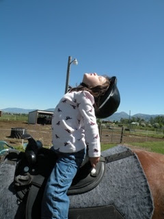 Today was one of those days that sounds good on paper but in truth left me a little frazzled. Morgane (my 4 year old) and I were not in synch, there was a lot of crazy energy going on at horsecamp (our once-a-week mom and daughter fun with horses and lots of other young girls) husband is still recovering from surgery and went back to work much to my chagrin, and I’ll stop right there. But there was a very soothing soul present amongst the chaos, and his name is Tres. As in uno dos tres. Morgane usually rides Tres, a sweet, small half Arab that is wonderful with kids. I’ve ridden him too, and been surprised at the pep he exhibits for a bigger rider. So we already were getting along quite well. Today, I went to catch Tres to saddle him up for Morgane, and while looking out to see where he was, could not spot him. Turns out he was laying down behind the shelter. And unlike most horses responding to the pull of instinct, he did not immediately and quickly come to his feet when I rounded the corner. Was he sick? Was something wrong?! He opened one big eye to gaze up at me. I knelt down to pet him. He lifted his head and sat up, but made no move to stand. I was astonished, as I’ve never been this close to a reclining horse. As I spoke softly to him and pet him, I felt tension leave my body. This sweet boy trusted me! After a few minutes, I encouraged him to his feet and haltered him. As Morgane and I brushed the dirt from his coat, I marveled at his gentle interest in her, the way he turned his head back to see what she was doing, how he allowed her to touch his velvet nose over and over and even dropped his head to let her do so. I felt that ever-present ounce of fear I always have around these beautiful and powerful animals leave my body too, as I witnessed this exchange between my daughter and horse. All my other concerns melted away; it was one of those moments where you want time to stand still. Gracias, Tres, for your gentle energy today. Here’s Morgane doing her saddle camel on him.