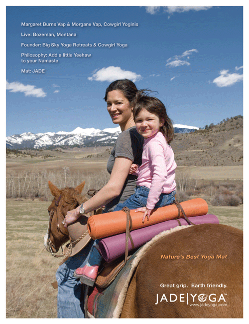 When you get the December ’09 issue of Yoga Journal, flip to page 25 to see me and Morgane in an ad for JADE Yoga. The copy reads, Philosophy: Add a little Yeehaw to Your Namaste. Of course. Thanks JADE for featuring Cowgirl Yoga! This pic was taken at the Cowgirl Yoga Ranch this past spring, and the equine model is Flash. He’s got a great butt, doesn’t he?